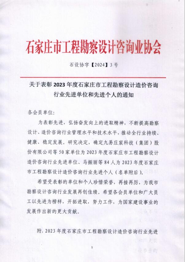 关于表彰2023年度石家庄市勘察设计造价咨询行业先进集体和先进个人的通知