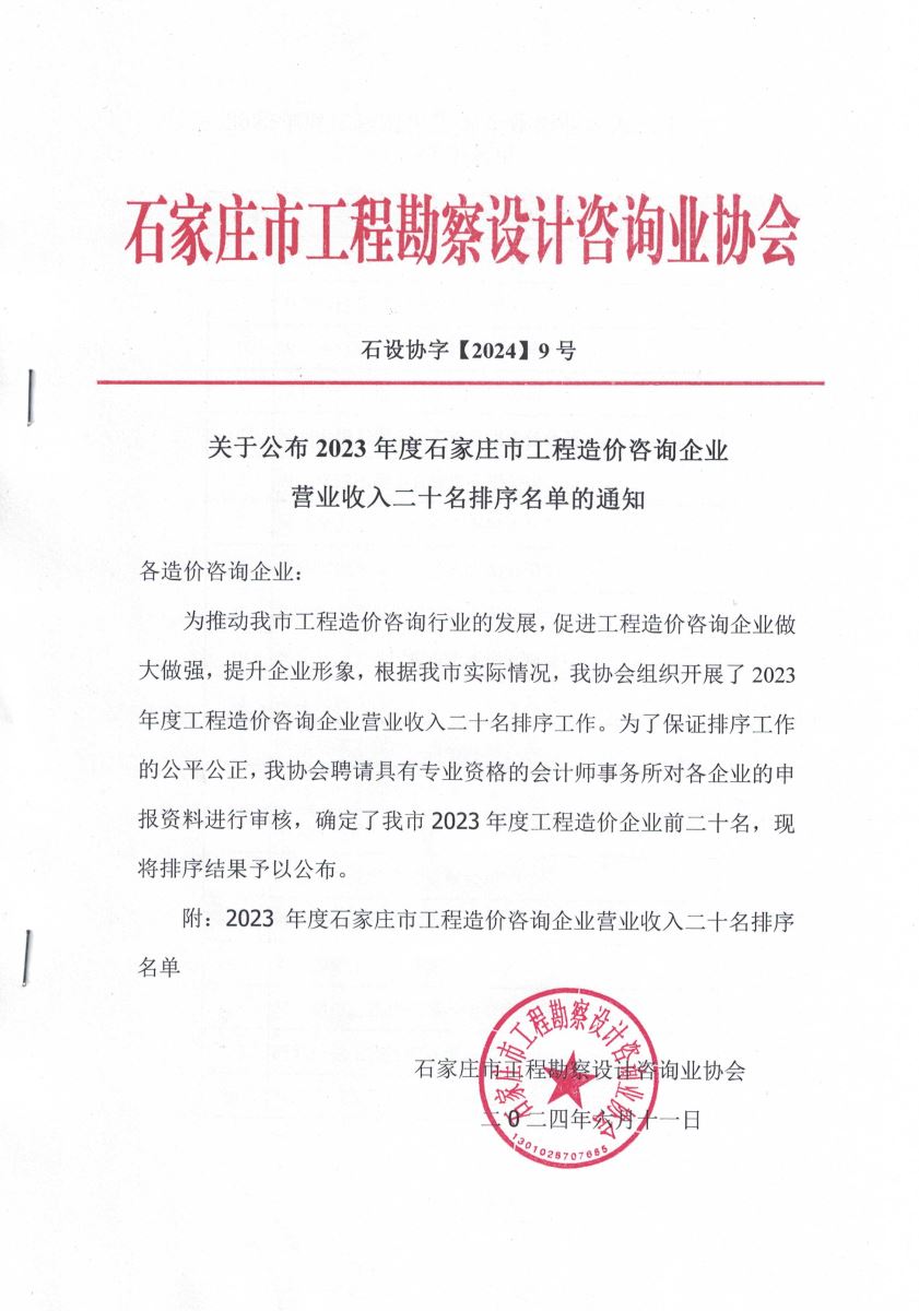 关于公布 2023年度石家庄市工程造价咨询企业营业收入二十名排序名单的通知