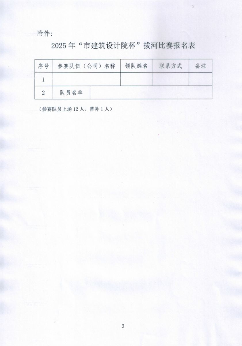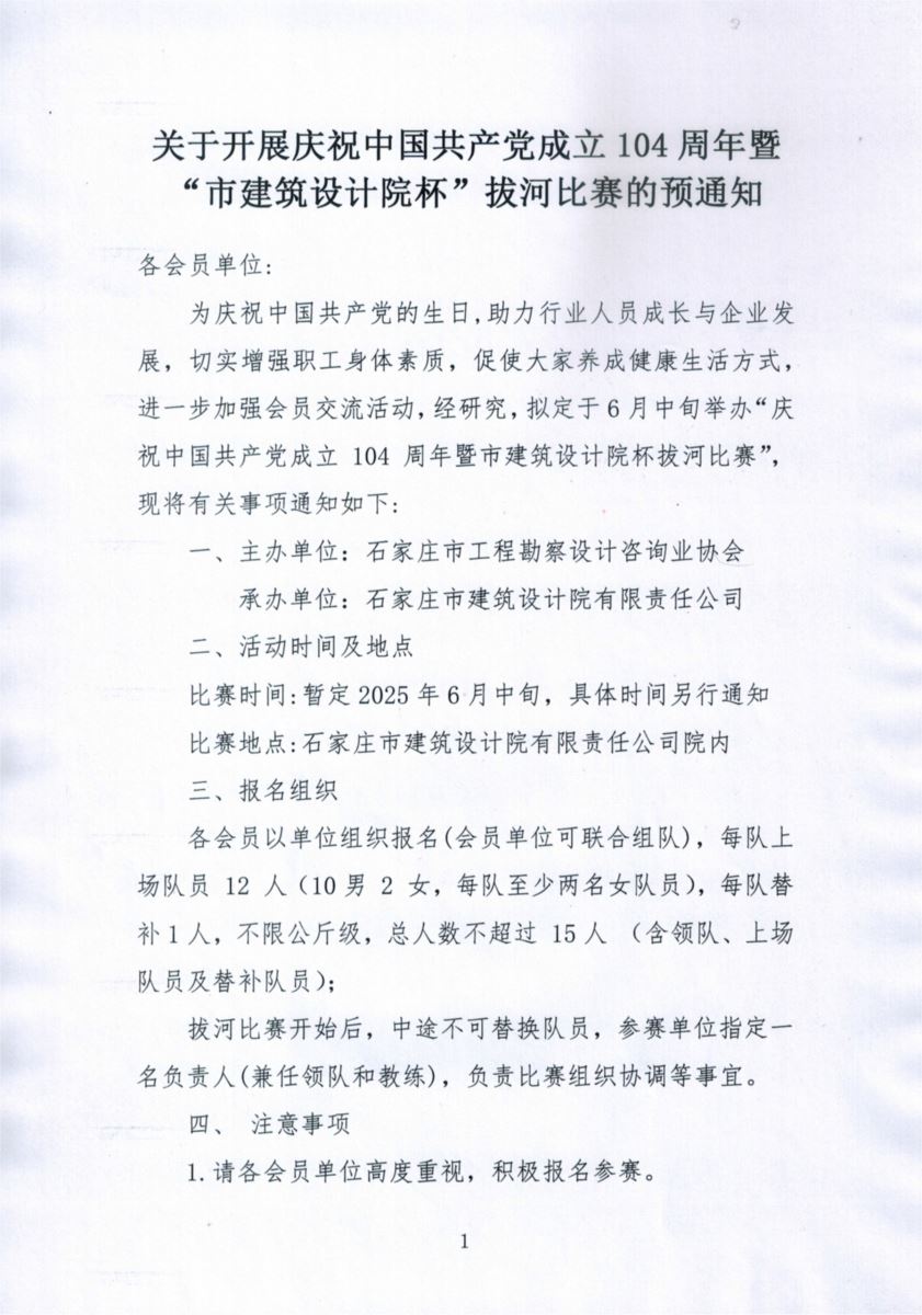 关于开展庆祝中国共产党成立104周年暨“市建筑设计院杯”拔河比赛的预通知