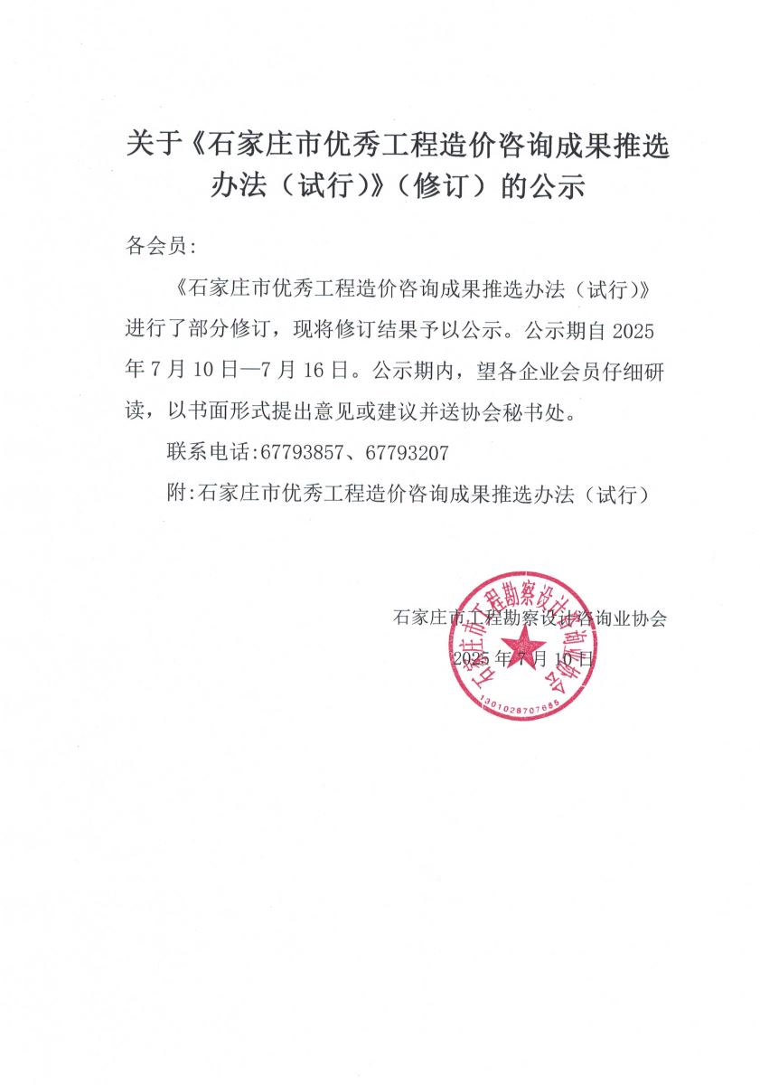 关于《石家庄市优秀工程造价咨询成果推选办法(试行)》(修订)的公示