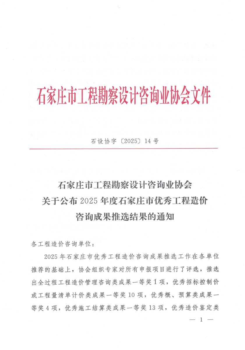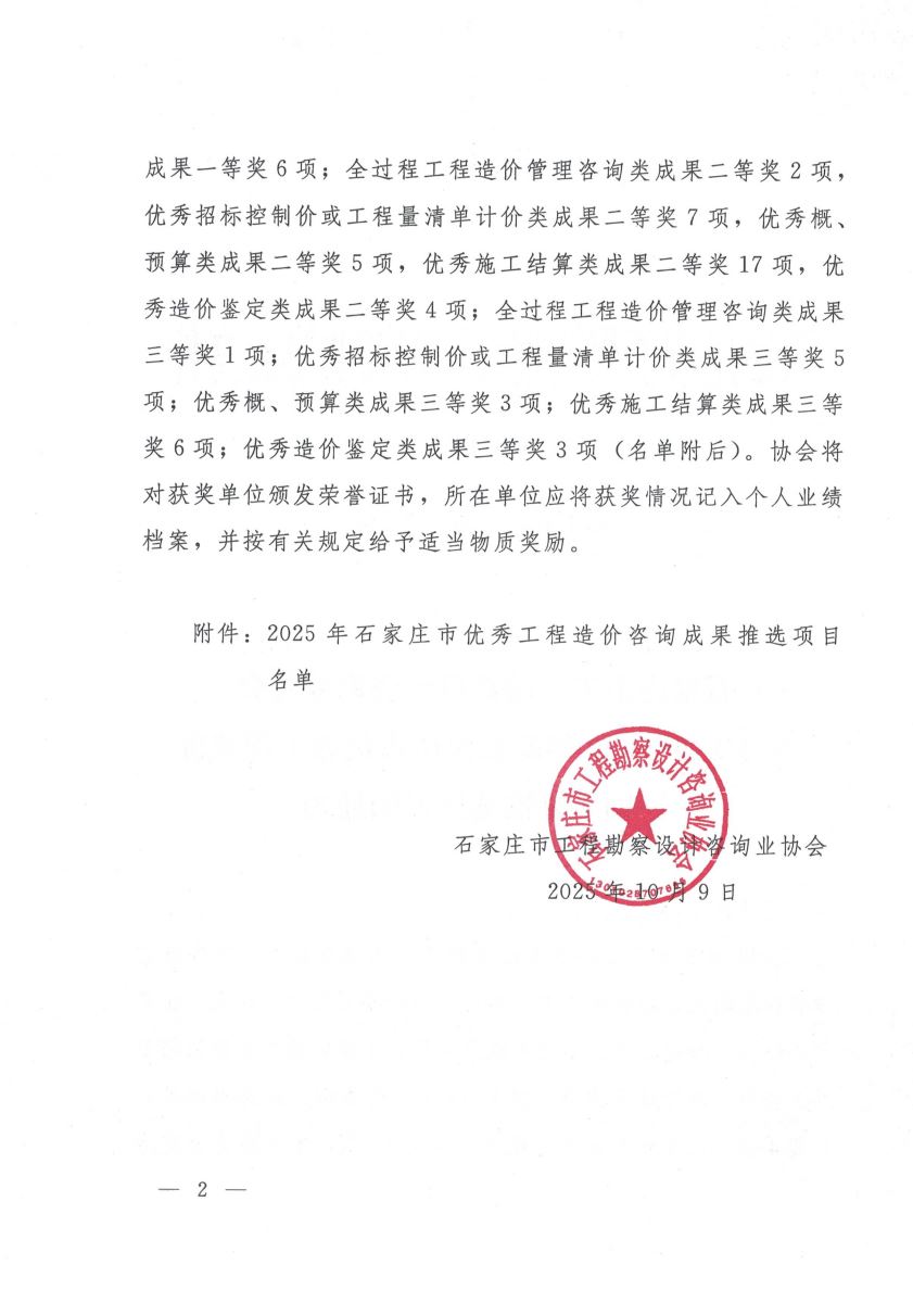 关于公布2025年度石家庄市优秀工程造价咨询成果推荐结果通知